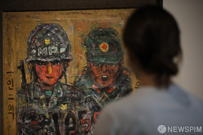 [서울=뉴스핌] 백인혁 기자 = 23일 오후 서울 종로구 국립현대미술관에서 한국전쟁 70년 '낯선 전쟁'전 언론간담회 참석자들이 이동표의 '일인이역 골육상잔'을 둘러보고 있다. 이번 전시는 한국전쟁으로 인한 피해와 상처를 극복하고, 전쟁을 비롯 코로나19 등 전 지구적 재난속에서 미술을 통한 치유와 평화의 비전을 제시하고자 마련된 대규모 기획전이다. 2020.06.23 dlsgur9757@newspim.com