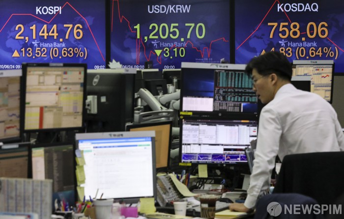 [서울=뉴스핌] 이한결 기자 = 미국의 기술주 중심 나스닥 지수가 사상 최고치를 경신한 24일 오전 코스피 지수가 전 거래일 대비 14.69포인트(0.69%) 오른 2,145.93에 개장했다. 코스닥 지수는 4.92포인트(0.65%) 오른 758.15에 출발했고 달러/원 환율은 2.8원 내린 1,206.0원에 장을 시작했다. 이날 서울 중구 하나은행 딜링룸에서 딜러들이 업무를 보고 있다. 2020.06.24 alwaysame@newspim.com