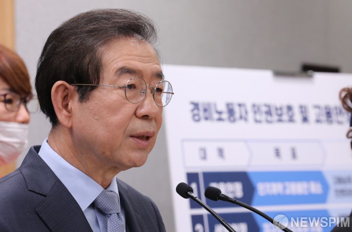 [서울=뉴스핌] 백인혁 기자 = 박원순 서울시장이 24일 오전 서울 중구 서울시청 브리핑실에서 '경비노동자 노동인권 보호 및 권리구제 종합대책' 기자설명회를 하고 있다. 2020.06.24 dlsgur9757@newspim.com