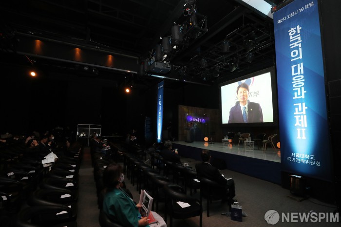 [서울=뉴스핌] 정일구 기자 = 24일 오후 서울 용산구 블루스퀘어에서 서울대학교 국가전략위원회와 카오스재단 주최로 열린 제2차 코로나19 포럼 '코로나 팬데믹, 한국의 대응과 과제Ⅱ'에서 참석자들이 김강립 보건복지부 차관의 주제발표 영상를 시청하고 하고 있다. 2020.06.24 mironj19@newspim.com