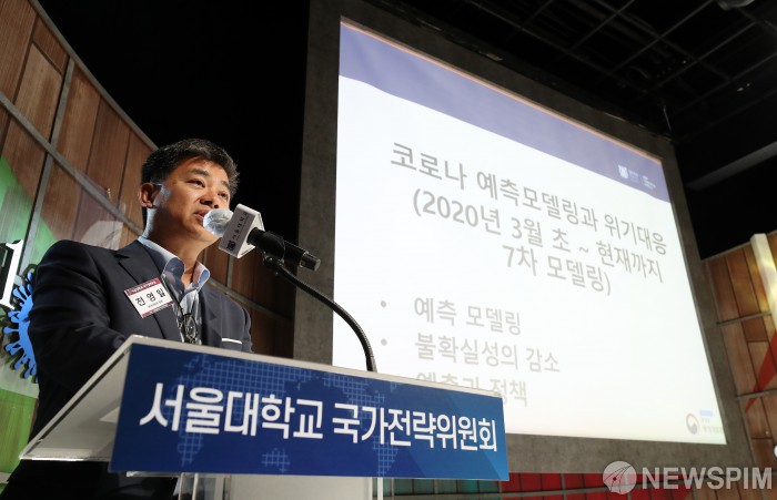 [서울=뉴스핌] 정일구 기자 = 전영일 통계개발원 원장이 24일 오후 서울 용산구 블루스퀘어에서 서울대학교 국가전략위원회와 카오스재단 주최로 열린 제2차 코로나19 포럼 '코로나 팬데믹, 한국의 대응과 과제Ⅱ'에서 주제발표를 하고 있다. 2020.06.24 mironj19@newspim.com