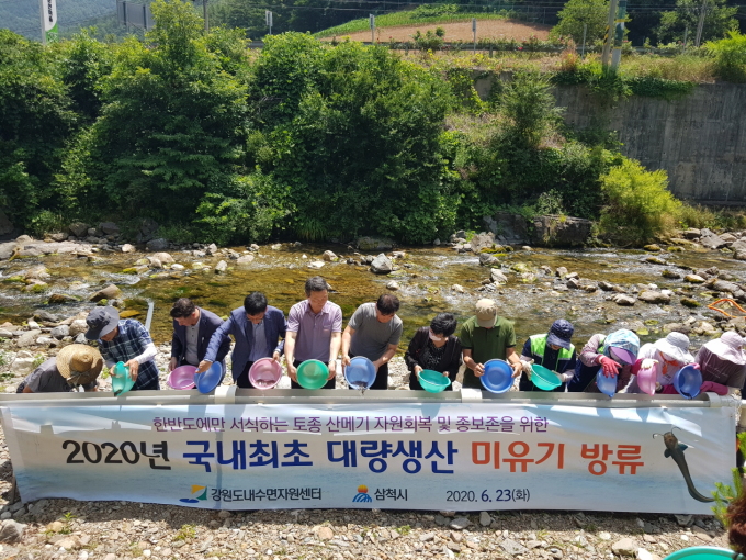 [삼척=뉴스핌] 이형섭 기자 = 강원 삼척시 수산자원센터는 지난 23일 토종 미유기(산메기) 인공종자 2만 마리를 삼척 신기면 무릉천에 처음으로 방류했다.