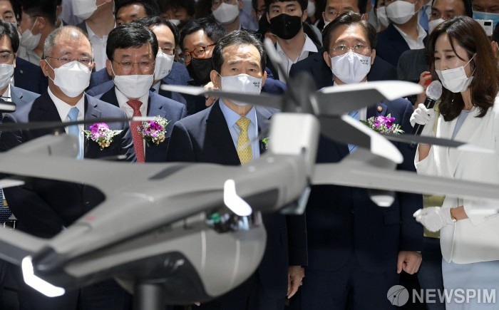 [고양=뉴스핌] 정일구 기자 = 정세균 국무총리와 성윤모 산업통상자원부 장관, 정만기 한국자동차산업협회 회장 겸 수소모빌리티+쇼 조직위원장, 정의선 현대자동차 수석부회장이 1일 오후 경기 고양시 킨텍스에서 열린 '2020 수소모빌리티+쇼'에서 현대자동차의 도심항공모빌리티(UAM) S-A1을 살펴보고 있다. 2020.07.01 mironj19@newspim.com