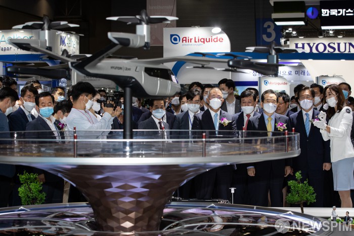[고양=뉴스핌] 정일구 기자 = 정세균 국무총리와 성윤모 산업통상자원부 장관, 정만기 한국자동차산업협회 회장 겸 수소모빌리티+쇼 조직위원장, 정의선 현대자동차 수석부회장이 1일 오후 경기 고양시 킨텍스에서 열린 '2020 수소모빌리티+쇼'에서 현대자동차의 도심항공모빌리티(UAM) S-A1을 살펴보고 있다. 2020.07.01 mironj19@newspim.com