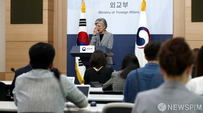 [서울=뉴스핌] 백인혁 기자 = 강경화 외교부 장관이 2일 오전 서울 종로구 정부서울청사 별관 브리핑실에서 내신기자단 브리핑을 마치고 기자들의 질문을 받고 있다. 2020.07.02 dlsgur9757@newspim.com