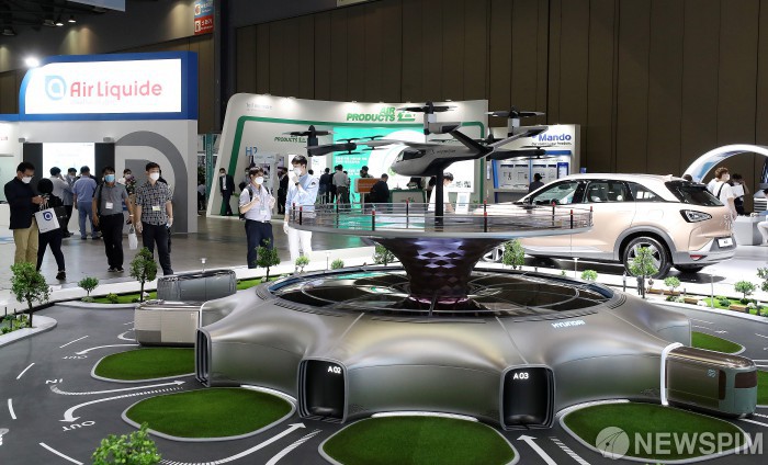 [고양=뉴스핌] 정일구 기자 = 2일 오후 경기 고양시 킨텍스에서 열린 '2020 수소모빌리티+쇼'를 찾은 관람객들이 현대자동차 UAM(도심항공모빌리티) S-A1 모델을 살펴보고 있다. 2020.07.01 mironj19@newspim.com
