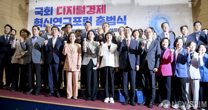 [서울=뉴스핌] 이형석 기자 = 6일 오전 서울 여의도 국회 의원회관에서 열린 국회디지털경제혁신연구포럼 출범식에서 참석자들이 기념촬영을 하고 있다. 2020.07.06 leehs@newspim.com