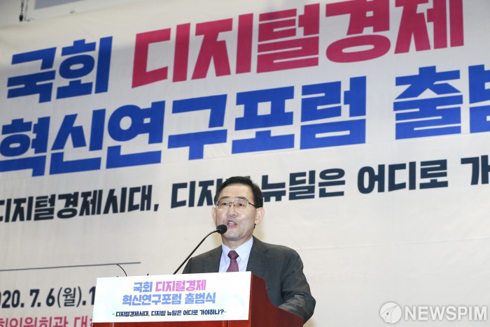 [서울=뉴스핌] 이형석 기자 = 주호영 미래통합당 원내대표(오른쪽 두번째)가 6일 오전 서울 여의도 국회 의원회관에서 열린 국회디지털경제혁신연구포럼 출범식에서 축사를 하고 있다. 2020.07.06 leehs@newspim.com