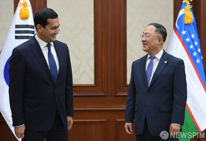 [서울=뉴스핌] 이한결 기자 = 홍남기 부총리 겸 기획재정부 장관(오른쪽)과 사르도르 우무르자코프 우즈베키스탄 부총리 겸 투자대외무역부장관이 7일 오후 서울 종로구 정부서울청사에서 열린 한-우즈백 경제부총리간 양자회담에 앞서 대화를 하고 있다. 2020.07.07 alwaysame@newspim.com