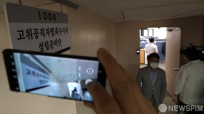 [서울=뉴스핌] 김학선 기자 = 8일 오후 서울 종로구 정부서울청사 내 고위공직자범죄수사처(공수처) 설립준비단 사무실 앞에 취재진이 몰려 있다. 2020.07.08 yooksa@newspim.com