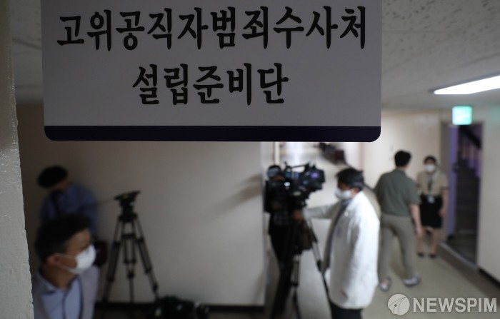 [서울=뉴스핌] 김학선 기자 = 8일 오후 서울 종로구 정부서울청사 내 고위공직자범죄수사처(공수처) 설립준비단 사무실 앞에 취재진이 몰려 있다. 2020.07.08 yooksa@newspim.com