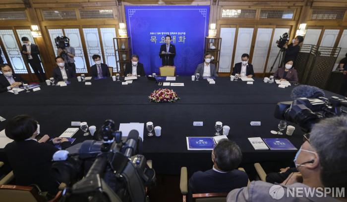 [서울=뉴스핌] 이한결 기자 = 정세균 국무총리가 9일 오후 서울 종로구 국무총리공관에서 열린 ‘제11차 목요대화, 코로나19와 항아리 경제로의 중심이동’에서 모두발언을 하고 있다. 2020.07.09 alwaysame@newspim.com