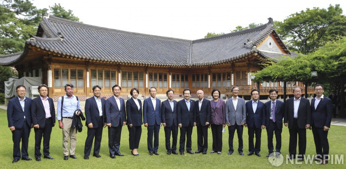 [서울=뉴스핌] 이한결 기자 = 정세균 국무총리, 박영선 중소벤처기업부 장관, 성윤모 산업통상자원부 장관을 비롯한 참석자들이 9일 오후 서울 종로구 국무총리공관에서 열린 ‘제11차 목요대화, 코로나19와 항아리 경제로의 중심이동’에서 기념촬영을 하고 있다. 2020.07.09 alwaysame@newspim.com