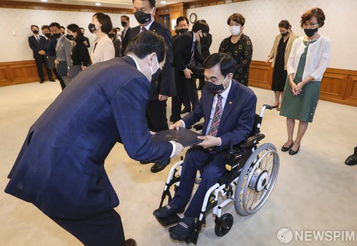 [서울=뉴스핌] 이한결 기자 = 정세균 국무총리가 10일 오전 서울 종로구 정부서울청사에서 열린 자원봉사진흥위원회 민간위원 위촉식에서 김현덕 위원에게 위촉장을 수여하고 있다. 2020.07.10 alwaysame@newspim.com