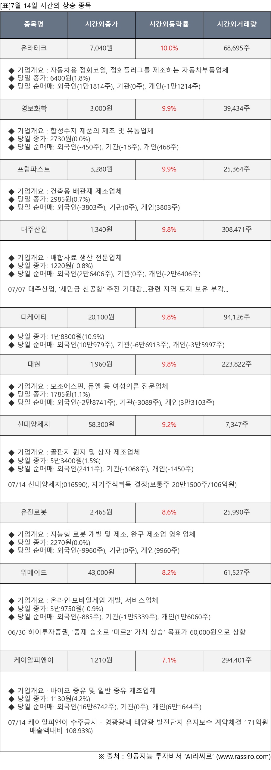 ※ 관련 종목: 유라테크, 영보화학, 프럼파스트, 대주산업, 디케이티, 대현, 신대양제지, 유진로봇, 위메이드, 케이알피앤이