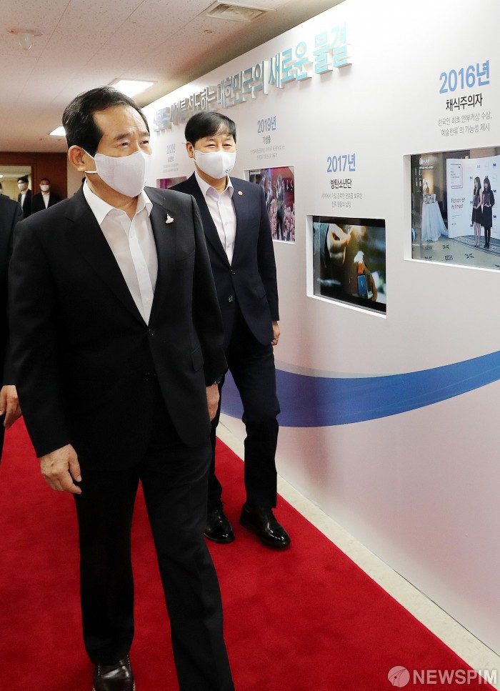 [서울=뉴스핌] 이한결 기자 = 정세균 국무총리가 16일 오전 서울 종로구 정부서울청사에서 국정현안점검조정회의 참석을 앞두고 박양우 문화체육관광부 장관과 함께 신한류 확산모델 미디어 전시를 관람하고 있다. 2020.07.16 alwaysame@newspim.com