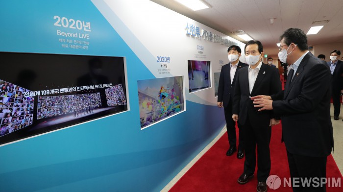 [서울=뉴스핌] 이한결 기자 = 정세균 국무총리가 16일 오전 서울 종로구 정부서울청사에서 국정현안점검조정회의 참석을 앞두고 박양우 문화체육관광부 장관과 함께 신한류 확산모델 미디어 전시를 관람하고 있다. 2020.07.16 alwaysame@newspim.com
