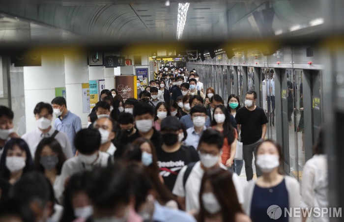 [서울=뉴스핌] 김학선 기자 = 최근 전 세계적으로 신종 코로나바이러스 감염증(코로나19)이 재확산되면서 누적 확진자 수가 1400만명에 육박하고 있는 가운데 17일 오전 서울 광화문역에서 출근길 시민들이 마스크를 쓴 채 발걸음을 재촉하고 있다. 2020.07.17 yooksa@newspim.com