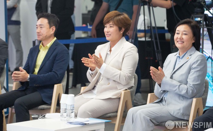 [서울=뉴스핌] 윤창빈 기자 = 박영선 중소벤처기업부 장관, 박세리 바즈인터내셔널 대표가 20일 오후 서울 강남구 팁스타운에서 열린 스마트 대한민국 펀드 출범식에서 박수를 치고 있다. 2020.07.20 pangbin@newspim.com