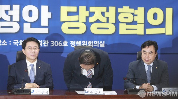 [서울=뉴스핌] 이형석 기자 = 홍남기 부총리 겸 기획재정부 장관(가운데)이 22일 오전 서울 여의도 국회 의원회관에서 열린 2020 세법개정안 당정협의에서 인사를 하고 있다. 2020.07.22 leehs@newspim.com