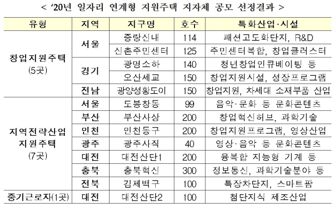 | 2020년 일자리 연계형 지원주택 지자체 공모 선정결과 [자료=국토부] |