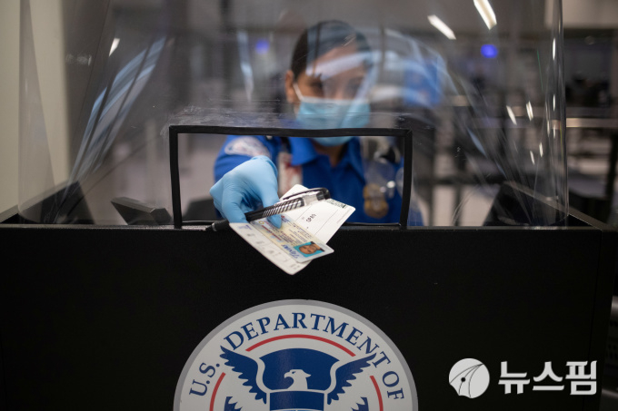 | [휴스턴 로이터=뉴스핌] 최원진 기자= 미국 텍사스주 휴스턴에 위치한 조지 부시 인터콘티넨털 공항에서 근무하는 한 교통보안청(TSA) 직원이 여행객에게 신분증을 돌려 주고 있다. 2020.07.21 |