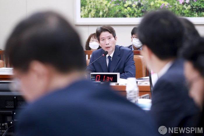 [서울=뉴스핌] 이형석 기자 = 이인영 통일부 장관 후보자가 23일 오전 서울 여의도 국회에서 열린 인사청문회에서 질의에 답하고 있다. 2020.07.23 leehs@newspim.com
