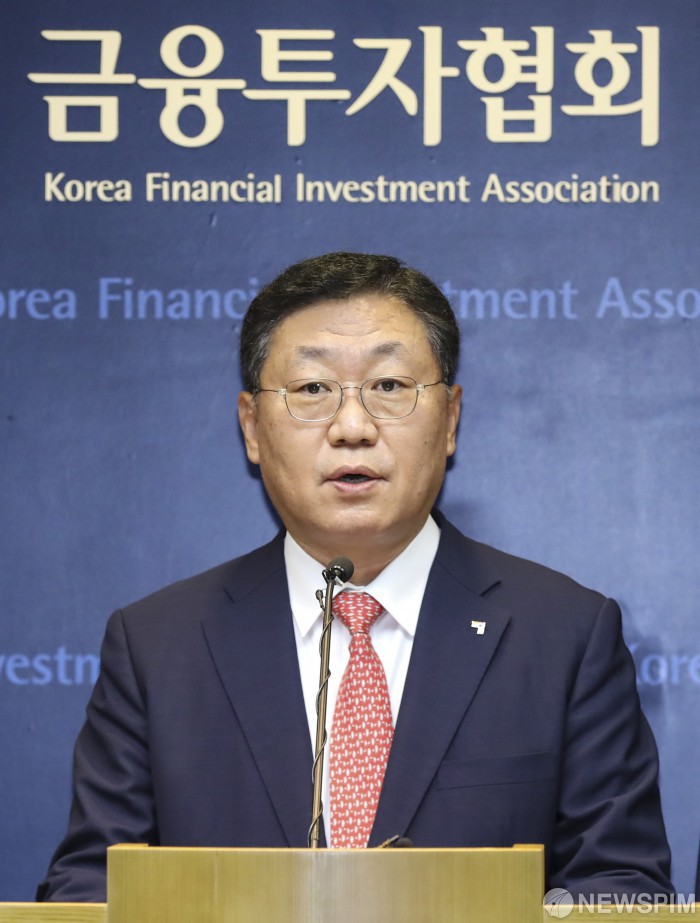 [서울=뉴스핌] 이한결 기자 = 나재철 금융투자협회 회장이 23일 오전 서울 여의도 한국금융투자협회 기자실에서 기자회견을 열고 사모펀드 관련 협회 입장을 발표하고 있다. 2020.07.23 alwaysame@newspim.com