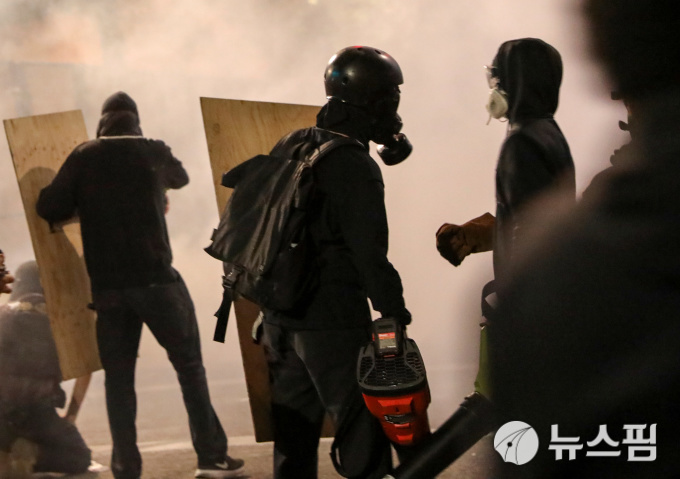| [포틀랜드=로이터 뉴스핌] 박진숙 기자=7월 23일(현지시간) 미국 오레곤주 포틀랜드에서 열린 인종 차별 반대 시위에서 참가자들이 연방요원이 쏜 최루탄 등에 대응하고 있다. 2020.07.24 justice@newspim.com |