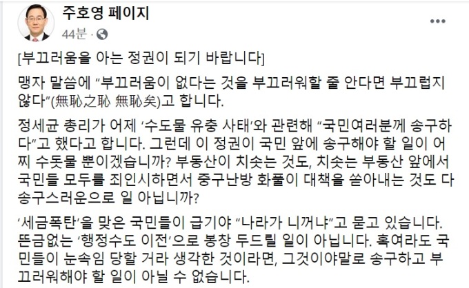 주 원내대표는 26일 자신의 SNS에 올린 글을 통해 "정세균 총리가 어제 수도물 유충 사태와 관련해 '국민 여러분께 송구하다'고 했다"며 "이 정권이 국민 앞에 송구해야 할 일이 어찌 수돗물 뿐이겠나. 부동산이 치솟는 것도, 치솟는 부동산 앞에서 국민들 모두를 죄인시하면서 중구난방 화풀이 대책을 쏟아내는 것도 다 송구스러운 일 아닌가"고 비판했다.