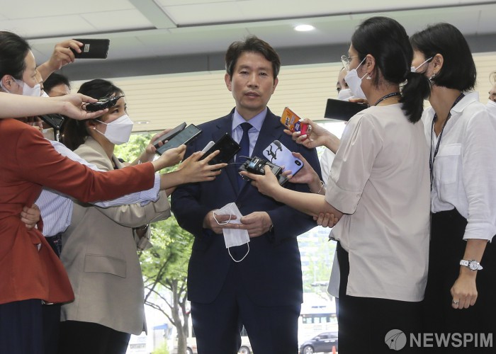 [서울=뉴스핌] 이한결 기자 = 문재인 대통령으로부터 임명 재가를 받은 이인영 통일부 장관이 27일 오후 서울 종로구 정부서울청사로 첫 출근을 하며 취재진의 질문에 답하고 있다. 2020.07.27 alwaysame@newspim.com