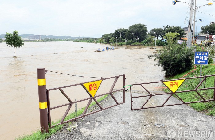 [안성=뉴스핌] 정종일 기자 = 2일 기록적인 폭우로 인해 경기도 안성시 일죽면 소재 청미천 천변 체육시설이 물에 참긴채 통행이 차단되어 있다. 2020.08.02 observer0021@newspim.com