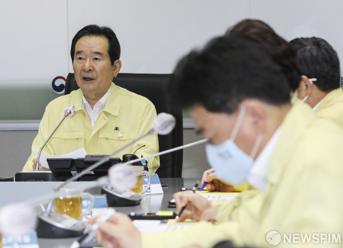 [서울=뉴스핌] 이한결 기자 = 정세균 국무총리가 3일 오전 서울 종로구 정부서울청사에서 열린 집중호우 대처상황 점검회의를 주재하고 있다. 2020.08.03 alwaysame@newspim.com