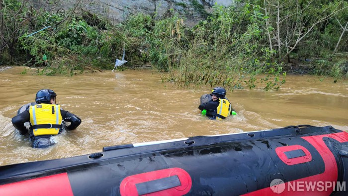 [춘천=뉴스핌] 이순철 기자 = 8일 춘천 의암호 전복 사고 실종자 수색에 나선 가운데 119 구조대원들이 수상보트를 타고 의암댐∼자라섬 구간에서 실종자 수색을 하고 있다.수색에는 소방,경찰,공무원 등 27400여명과 헬기 13대, 드론 26 등 총 128대의 장비와 인원이 투입돼 항공,육상 수색에 나섰다. 의암호 전복 사고는 6일 오전 11시 34분께 춘천시 서면 의암댐 상부 500m 지점에서 인공 수초섬 고박 작업에 나선 민간 고무보트와 춘천시청 환경감시선, 경찰정 등 선박 3척이 전복돼 8명 중 1명이 숨지고 5명이 실종됐다. 2020.08.08 grsoon815@newspim.com