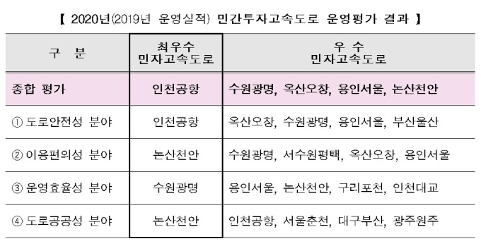 국토교통부는 약 두 달에 걸쳐 운영평가를 실시한 결과 인천국제공항고속도로가 최우수 등급이며 수원광명고속도로, 옥산오창고속도로, 용인서울고속도로, 논산천안고속도로가 각각 우수 등급으로 선정됐다고 11일 밝혔다.