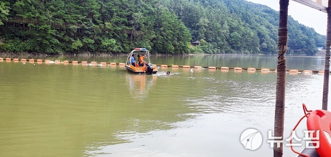 | [안동=뉴스핌] 이민 기자 = 6일 오전 11시40분쯤 경찰과 소방당국이 안동댐 하류 월영교 밑의 조정지댐 부근 오탁방지막에서 지난 6일 오전 투신한 것으로 추정된 실종자 A(31)씨의 사체를 인양하고 있다. 2020.08.11 lm8008@newspim.com |