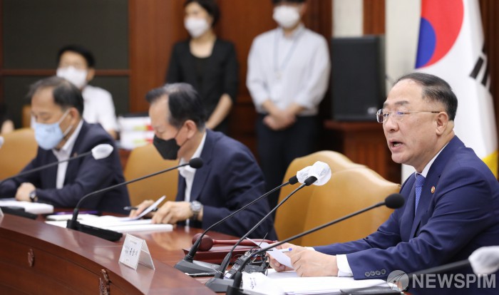 [서울=뉴스핌] 백인혁 기자 = 홍남기 부총리 겸 기획재정부 장관(오른쪽)이 18일 오후 서울 종로구 정부서울청사에서 열린 제22차 국유재산정책심의위원회에서 모두발언을 하고 있다. 2020.08.18 dlsgur9757@newspim.com