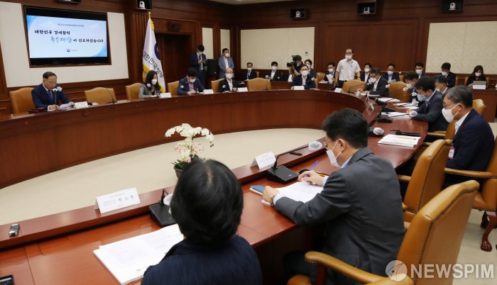 [서울=뉴스핌] 백인혁 기자 = 홍남기 부총리 겸 기획재정부 장관(왼쪽)이 18일 오후 서울 종로구 정부서울청사에서 열린 제22차 국유재산정책심의위원회에서 모두발언을 하고 있다. 2020.08.18 dlsgur9757@newspim.com