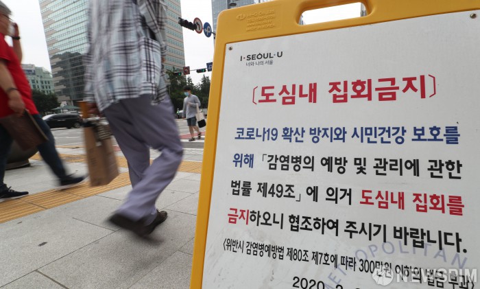 [서울=뉴스핌] 김학선 기자 = 서울시가 코로나19 확산을 막기 위해 10인 이상 집회를 전면 금지한 21일 광화문 광장 일대에 집회금지를 알리는 안내판이 설치되어 있다. 2020.08.21 yooksa@newspim.com