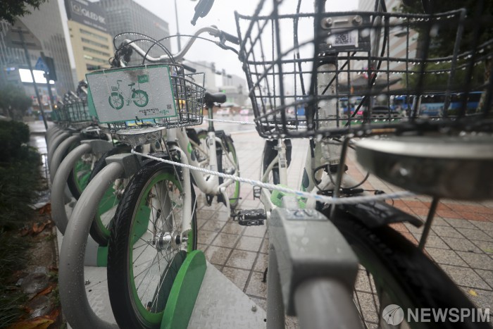 [서울=뉴스핌] 이형석 기자 = 제8호 태풍 '바비(BAVI)'의 영향으로 강한 바람과 비가 내리는 27일 오전 서울 종로구 광화문 네거리 인근에 설치된 공공자전거 따릉이가 피해를 방지하기 위해 줄에 묶여 있다. 2020.08.27 leehs@newspim.com