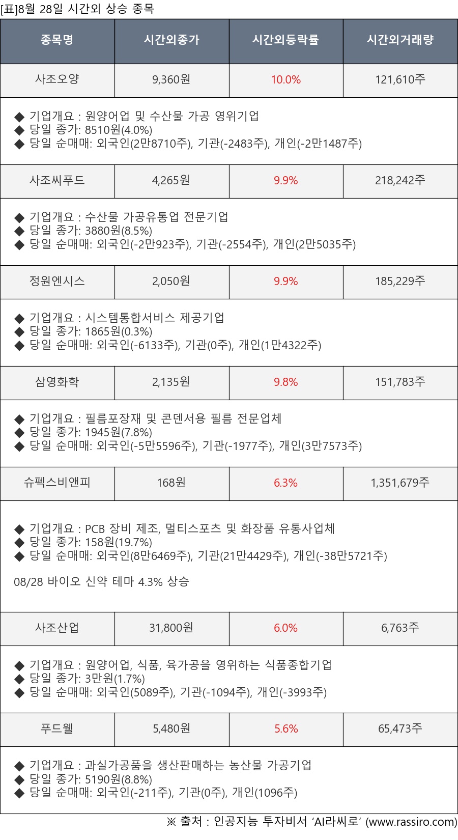※ 관련 종목: 사조오양, 사조씨푸드, 정원엔시스, 삼영화학, 슈펙스비앤피, 사조산업, 푸드웰