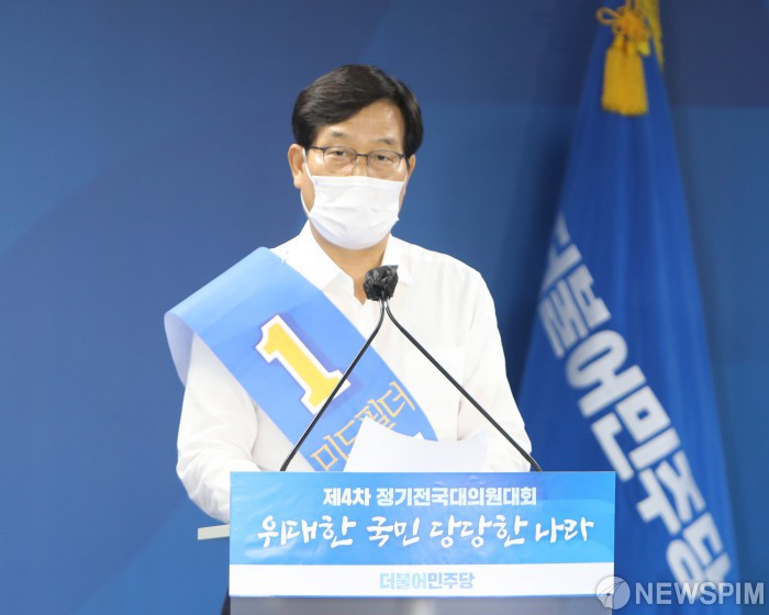[서울=뉴스핌] 신동근 더불어민주당 최고위원 후보자가 29일 오후 서울 여의도 더불어민주당 당사에서 열린 ‘제4차 정기전국대의원대회’에서 정견발표를 하고 있다. 이번 전당대회는 코로나19 확산 방지를 위해 민주당 유튜브 채널을 이용한 온라인 비대면 방식으로 진행됐다. [사진=더불어민주당] 2020.08.29 alwaysame@newspim.com
