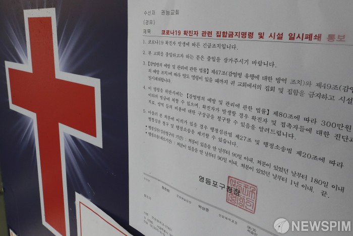[서울=뉴스핌] 이형석 기자 = 31일 오후 서울 영등포구 권능교회에 코로나 19 확진자가 발생해 폐쇄되어 있다. 권능교회 예배에 참석한 32명중 16명이 양성 판정을 받았다. 2020.08.31 leehs@newspim.com