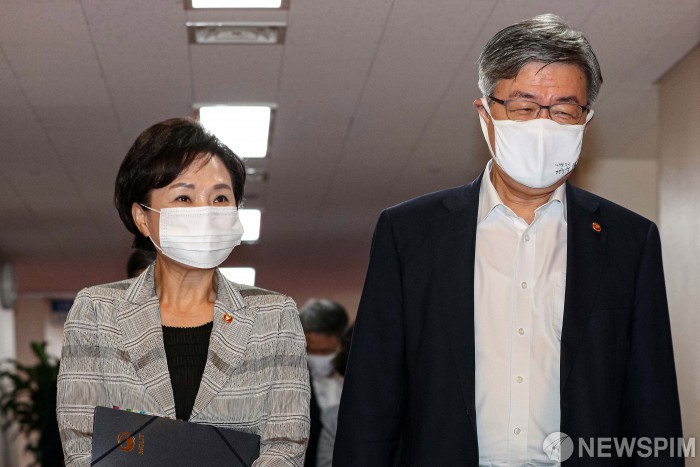 [서울=뉴스핌] 이한결 기자 = 김현미 국토교통부 장관(왼쪽)과 이재갑 고용노동부 장관이 1일 오전 서울 종로구 정부서울청사에서 열린 국무회의에 입장하고 있다. 2020.09.01 alwaysame@newspim.com
