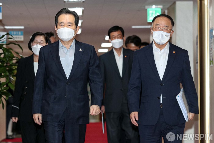 [서울=뉴스핌] 이한결 기자 = 정세균 국무총리(왼쪽)와 홍남기 부총리 겸 기획재정부 장관이 1일 오전 서울 종로구 정부서울청사에서 열린 국무회의에 입장하고 있다. 2020.09.01 alwaysame@newspim.com