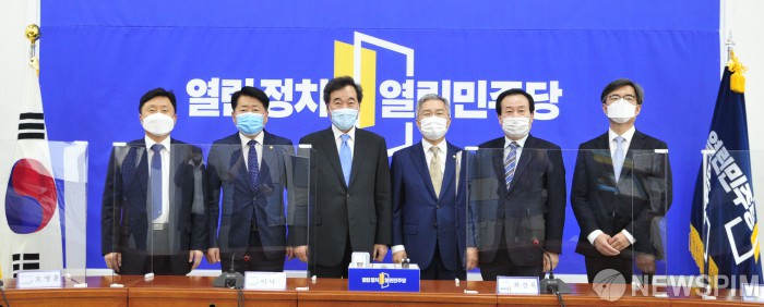[서울=뉴스핌] 최상수 기자 = 이낙연 더불어민주당 신임 대표가 1일 오후 서울 여의도 국회 열린민주당 대표실을 찾아 최강욱 열린민주당 대표와 기념촬영을 하고 있다. 2020.09.01 kilroy023@newspim.com