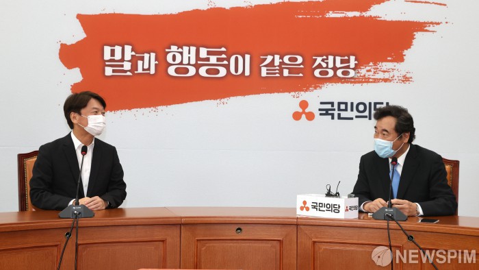 [서울=뉴스핌] 최상수 기자 = 이낙연 신임 더불어민주당 대표(오른쪽)가 1일 오후 서울 여의도 국회에서 안철수 국민의당 대표(왼쪽)를 예방하여 대화를 나누고 있다. 2020.09.01 kilroy023@newspim.com