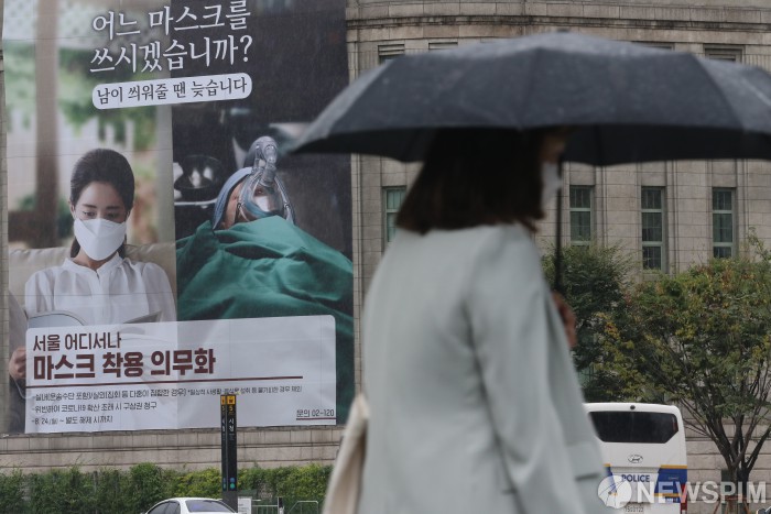 [서울=뉴스핌] 백인혁 기자 = 한반도를 향해 북상중인 제9호 태풍 '마이삭'의 영향으로 전국에 비가 내리는 2일 오후 서울 중구 서울도서관 외벽에 마스크 착용 의무화 안내 문구가 적힌 대형 포스터가 게시되어 있다. 포스터에는 서울 어디서나 마스크 착용 의무화를 알리는 안내 문구와 함께 마스크 착용 위반으로 코로나19 확산 초래시 구상권을 청구한다는 내용의 문구도 적혀 있다. 2020.09.02 dlsgur9757@newspim.com