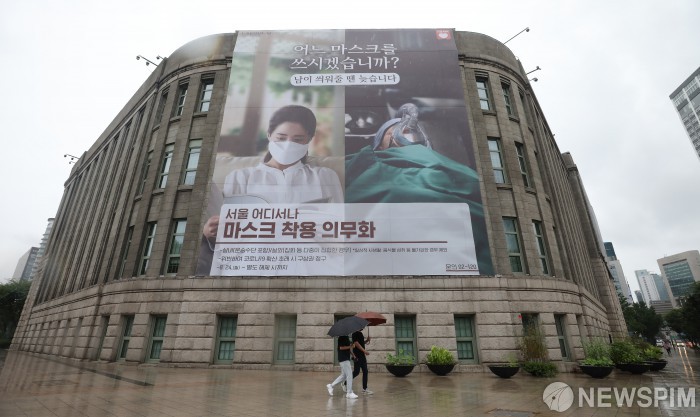 [서울=뉴스핌] 백인혁 기자 = 한반도를 향해 북상중인 제9호 태풍 '마이삭'의 영향으로 전국에 비가 내리는 2일 오후 서울 중구 서울도서관 외벽에 마스크 착용 의무화 안내 문구가 적힌 대형 포스터가 게시되어 있다. 포스터에는 서울 어디서나 마스크 착용 의무화를 알리는 안내 문구와 함께 마스크 착용 위반으로 코로나19 확산 초래시 구상권을 청구한다는 내용의 문구도 적혀 있다. 2020.09.02 dlsgur9757@newspim.com