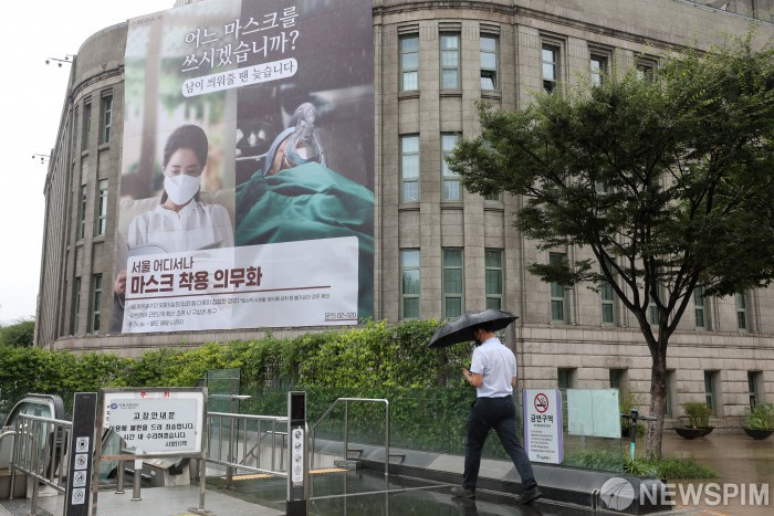 [서울=뉴스핌] 백인혁 기자 = 한반도를 향해 북상중인 제9호 태풍 '마이삭'의 영향으로 전국에 비가 내리는 2일 오후 서울 중구 서울도서관 외벽에 마스크 착용 의무화 안내 문구가 적힌 대형 포스터가 게시되어 있다. 포스터에는 서울 어디서나 마스크 착용 의무화를 알리는 안내 문구와 함께 마스크 착용 위반으로 코로나19 확산 초래시 구상권을 청구한다는 내용의 문구도 적혀 있다. 2020.09.02 dlsgur9757@newspim.com